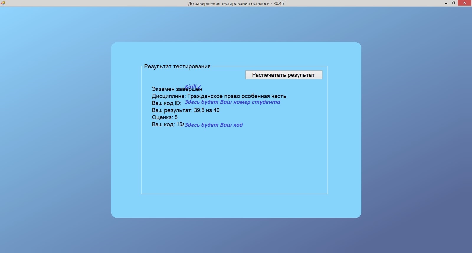 Вопросы в тесте для сверки, в программе Testclient предмет должен называться точно так же как этот: