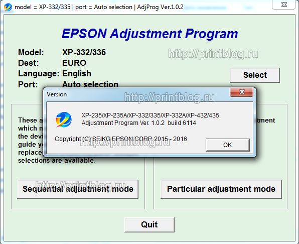 Adjustment program Epson XP-235, XP-235A, XP-332, XP-335, XP-332A, XP-432, XP-434, XP-435 - это сервисная программа для указанных моделей принтеров, программа позволяет сбросить счетчик памперса (отрботка, абсорбер), прописывать ID печатающей головки, делать инициализацию принтера и другие функции.