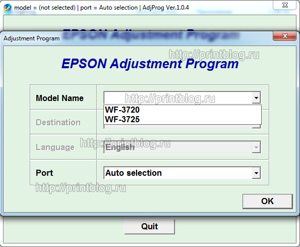 Adjustment program Epson WF-3720, WF-3725 - это сервисная программа для указанных моделей принтеров, программа позволяет сбросить счетчик памперса (отработка, абсорбер), прописывать ID печатающей головки, делать инициализацию принтера и другие функции.