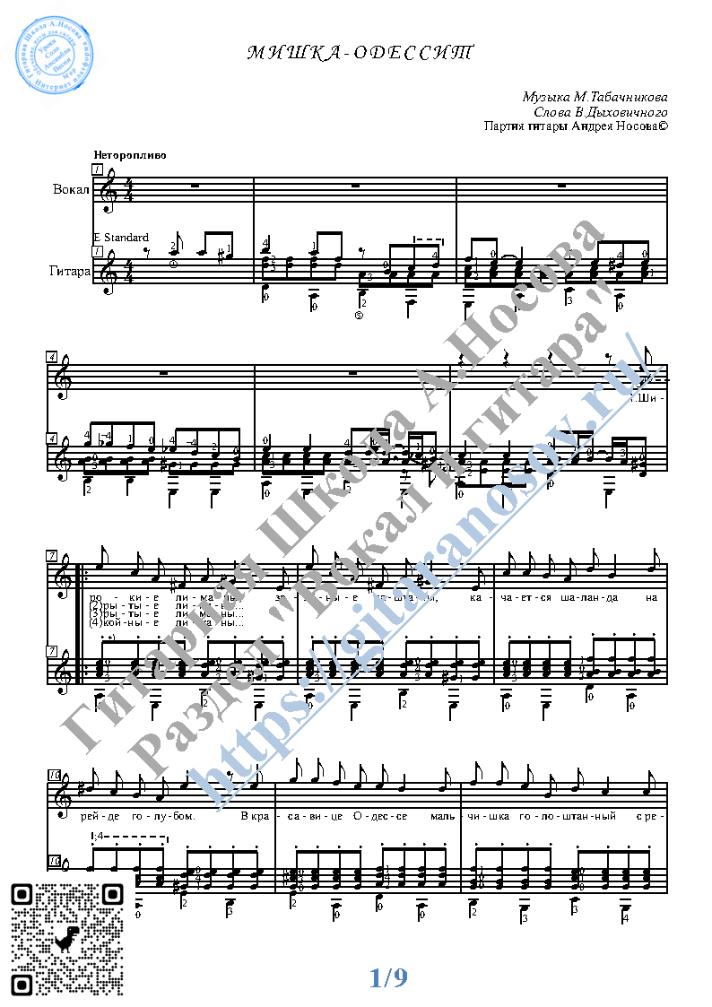 Вашему вниманию предлагается композиция "Мишка-одессит (муз.М.Табачникова, сл.В.Дыховичного)", предназначенная для вокала в сопровождении 6-ти струнной гитары. Запись выполнена нотами и включает в себя партию вокала с подтекстовкой, партию гитары с подробнейшей аппликатурой и текст песни (НА РУССКОМ).