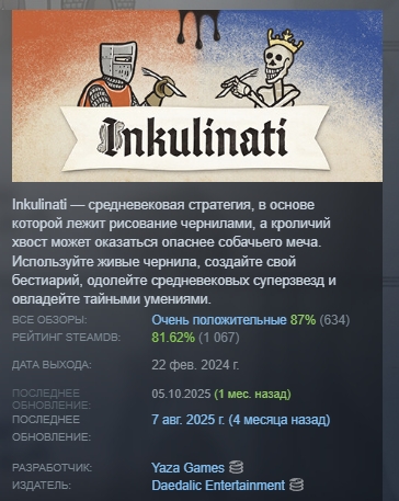 Inkulinati — пошаговая стратегия, вдохновленная средневековыми манускриптами. Создайте армию чудовищ, пролейте чернильную кровь врагов, одолейте средневековых суперзвезд и овладейте тайными умениями. Чтобы в совершенстве освоить перо, вам придется внимательно следить за происходящим и просчитывать каждый ход. Отправьтесь в путешествие и станьте величайшим из мастеров Inkulinati!