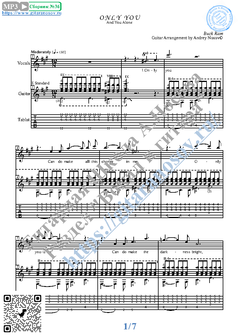 Вашему вниманию предлагается композиция "Only You (B.Ram)", предназначенная для вокала в сопровождении 6-ти струнной гитары. Запись выполнена нотами и включает в себя партию вокала с подтекстовкой, партию гитары с подробнейшей аппликатурой и текст песни (НА АНГЛИЙСКОМ). Партия гитары продублирована табулатурой.