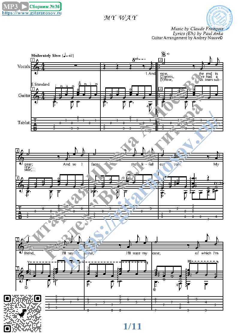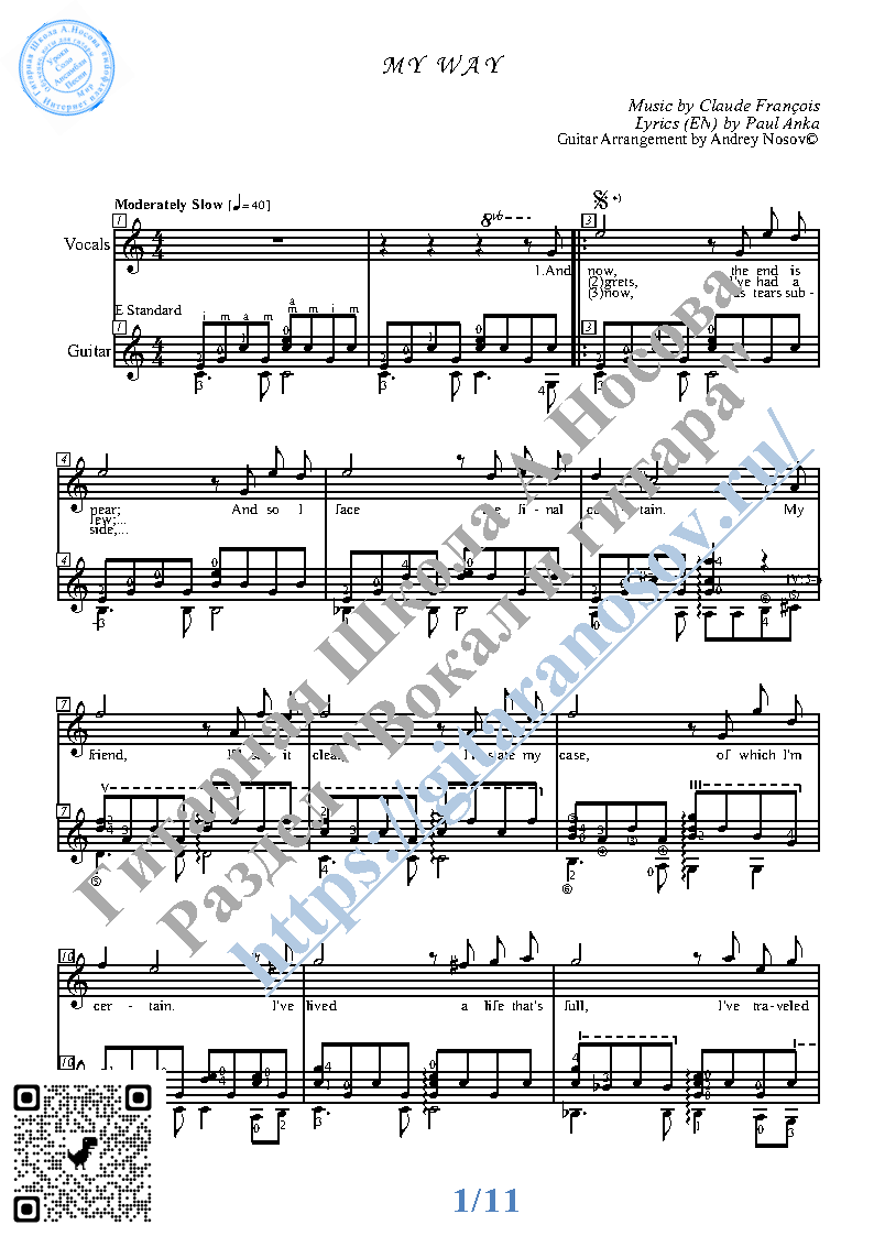 Вашему вниманию предлагается композиция "My Way (mus.C.Francois, lyr.P.Anka)", предназначенная для вокала в сопровождении 6-ти струнной гитары. Запись выполнена нотами и включает в себя партию вокала с подтекстовкой, партию гитары с подробнейшей аппликатурой и текст песни (НА АНГЛИЙСКОМ). Партия гитары продублирована табулатурой.
