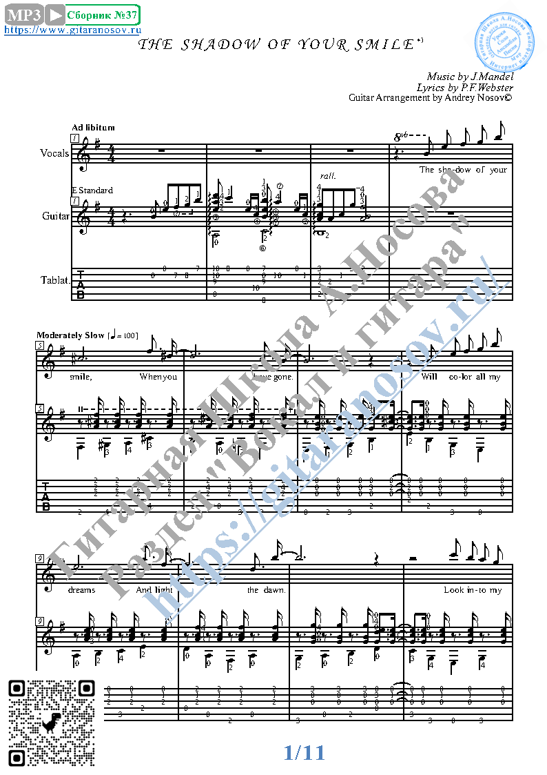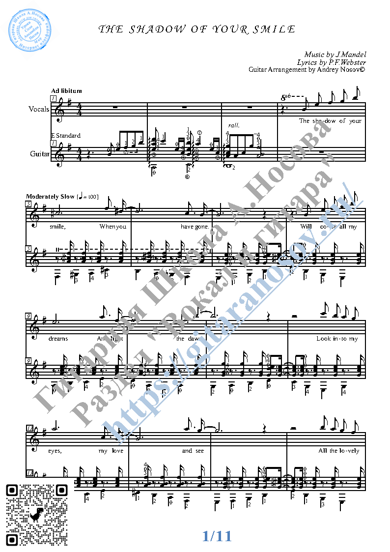 Вашему вниманию предлагается композиция "The Shadow of Your Smile (mus.J.Mandel, lyr.P.F.Webster)", предназначенная для вокала в сопровождении 6-ти струнной гитары. Запись выполнена нотами и включает в себя партию вокала с подтекстовкой, партию гитары с подробнейшей аппликатурой и текст песни (НА АНГЛИЙСКОМ). Партия гитары продублирована табулатурой.