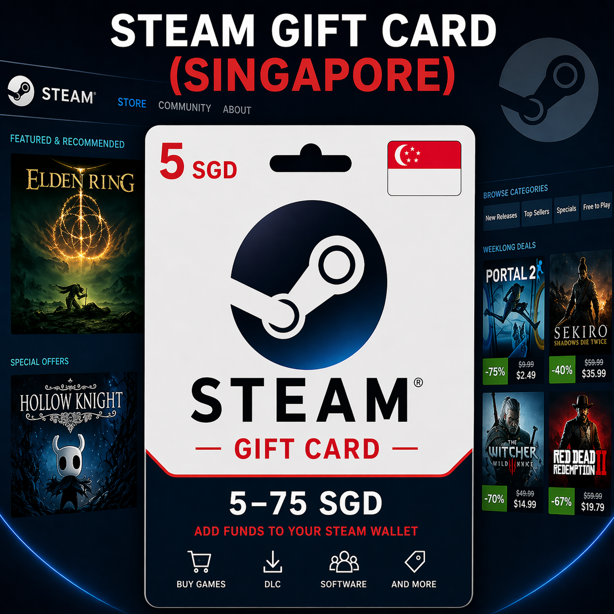 Подарочную карту Steam (Сингапур) номиналом от 5 до 75 SGD — выберите нужную сумму при покупке.