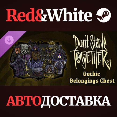 This Gothic Belongings Chest contains the following skin items: Gloomy Wrapping, Gothic Firepit, Gothic Fence, Stained Glass Gate, Gothic Lantern, Gothic Thundercaller, Derelict Manor, Gothic Alchemical Kiln, Gothic Scientific Instrument, Gothic Artificer´s Table, Gothic Pillar, and Gothic Wardrobe.