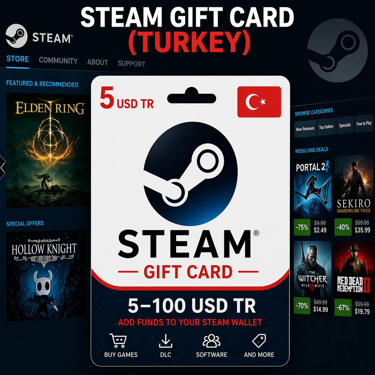 Подарочную карту Steam (Турция) номиналом от 5 до 100 USD TR — выберите нужную сумму при покупке.