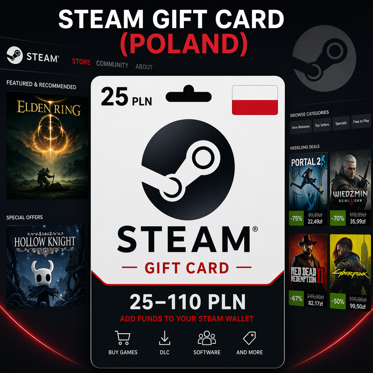 Подарочную карту Steam (Польша) номиналом от 25 до 110 PLN — выберите нужную сумму при покупке.