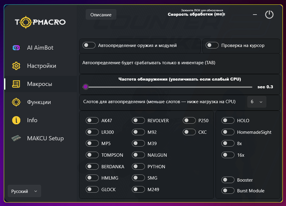https://t.me/topmacroВНИМАНИЕ!Использование программы для игры RUST только на свой страх и риск (если вы саму игру запускаете на своем ПК). Для максимально безопасной (100% без банов) игры рекомендуем запускать игру только через облачный гейминг — например, GeForce NOW (GFN) или любой другой сервис./ppПрограмма использует интеллектуальную хуманизацию (рандомизацию) всех виртуальных движений мыши. Благодаря этому система VAC LIVE не сможет заподозрить подозрительные действия. Такой софт безопаснее, чем макросы для мышек, где движения всегда повторяются по одному и тому же паттерну./pИИ-ПОМOЩНИК ДЛЯ АВТОНАВЕДЕНИЯ