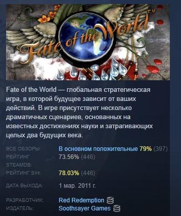 Fate of the World — глобальная стратегическая игра, в которой будущее зависит от ваших действий. В игре присутствует несколько драматичных сценариев, основанных на известных достижениях науки и затрагивающих целых два будущих века.