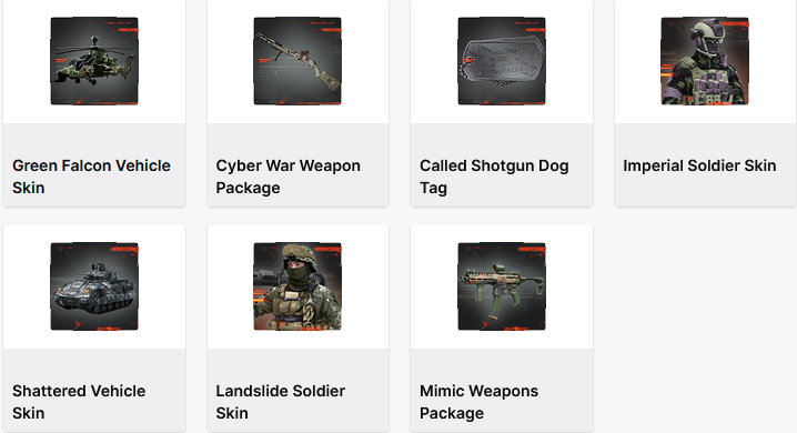 1. Mimic Weapons Package 2. Shattered Vehicle Skin 3. Called Shotgun Dog Tag 4. Imperial Soldier Skin 5. Cyber War Weapon Package 6. Landslide Soldier Skin 7. Green Falcon Vehicle Skin