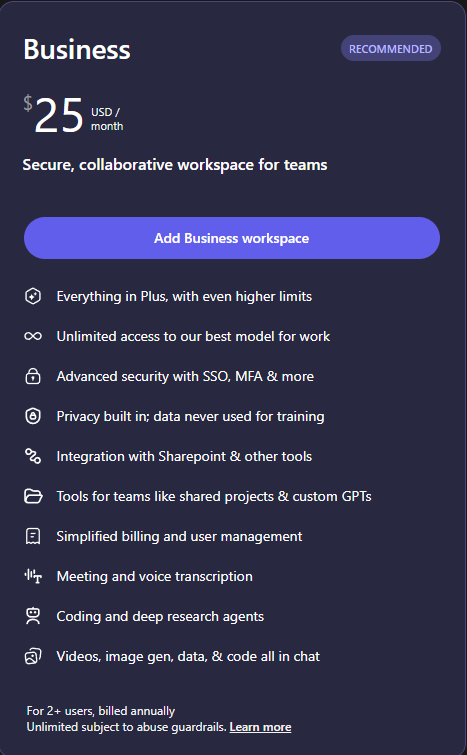 - Новую учетную запись ChatGPT с 1-месячной подпиской Team/Business Plan.