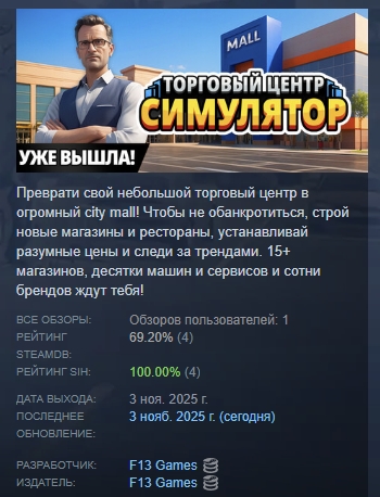 Преврати свой небольшой торговый центр в огромный city mall! Чтобы не обанкротиться, строй новые магазины и рестораны, устанавливай разумные цены и следи за трендами. 15+ магазинов, десятки машин и сервисов и сотни брендов ждут тебя!