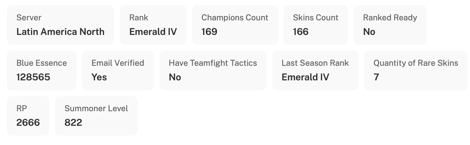 💎 Поднимите свой игровой опыт на новый уровень с этим премиальным аккаунтом League of Legends, достигшим 822-го уровня и ранга «Изумруд IV». В него входят 169 чемпионов, 128 565 единиц Синей эссенции, 2666 Riot Points и 7 редких скинов. Вы получите полный доступ к аккаунту Riot Games и привязанной к нему электронной почте, а также сможете привязать свою. Настройте параметры аккаунта в соответствии со своим уникальным стилем.