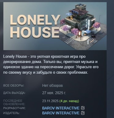 Lonely House - это уютная крохотная игра про декорирование дома. Только вы, приятная музыка и одинокое здание на пересечении дорог. Украсьте его по своему вкусу и забудьте о своих проблемах.