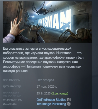 Вы оказались заперты в исследовательской лаборатории, где изучают пауков. Huntsman — это хоррор на выживание, где арахнофобия правит бал. Реалистичное поведение пауков и напряженная атмосфера — Huntsman пощекочет вам нервы как никогда раньше.