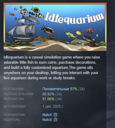 Idlequarium — это казуальная игра-симулятор, в которой вы выращиваете очаровательных маленьких рыбок, зарабатываете монеты, покупаете украшения и строите полностью индивидуальный аквариум. Игра размещается в любом месте вашего рабочего стола, позволяя вам взаимодействовать с вашим живым аквариумом во время работы или перерывов в учебе.