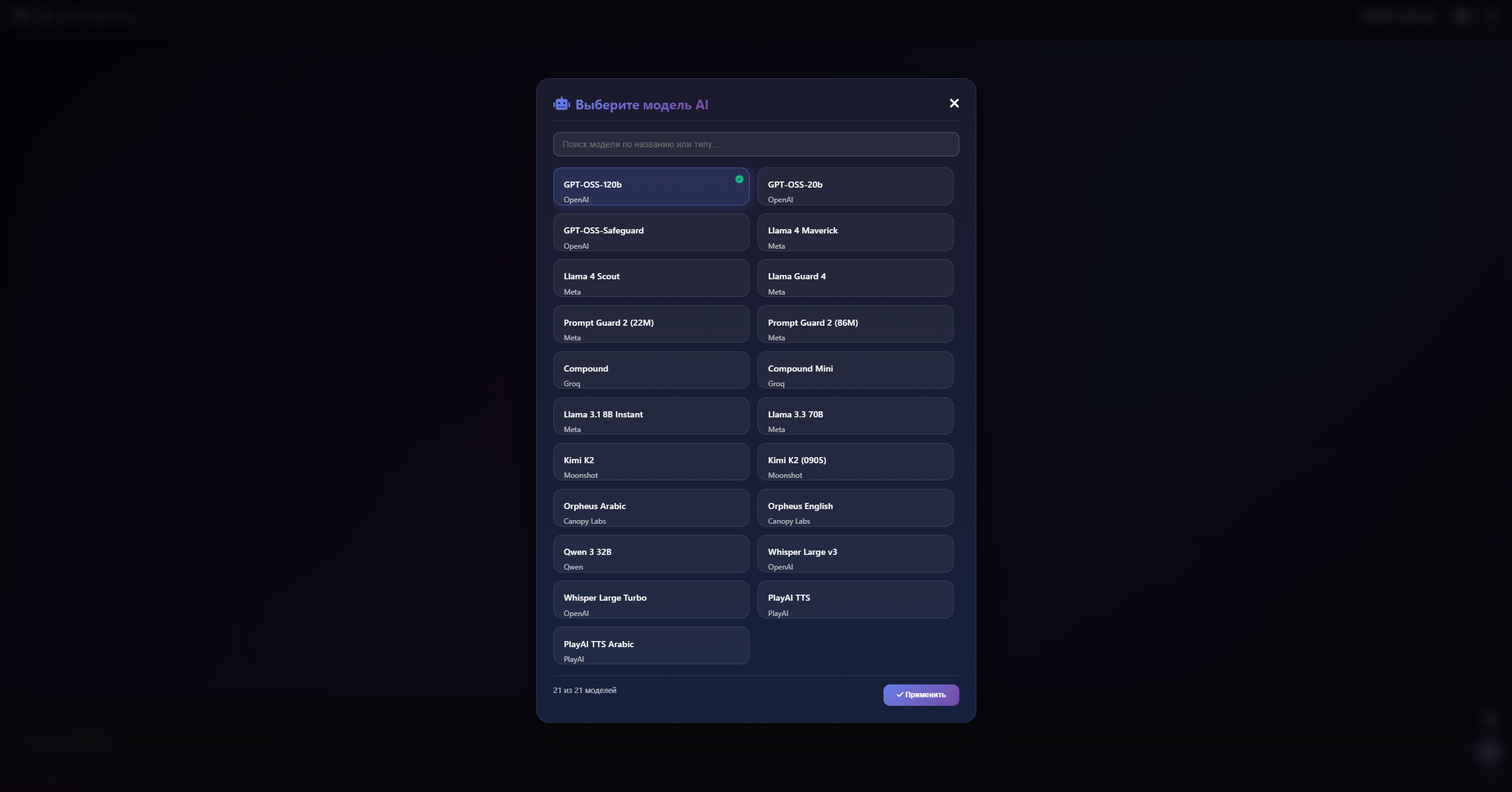 - openai/gpt-oss-120b — флагманская модель от OpenAI (аналог GPT-4).
