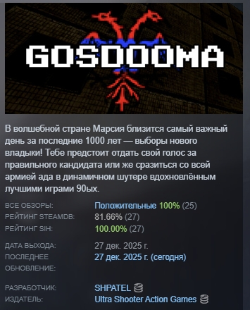 В волшебной стране Марсия близится самый важный день за последние 1000 лет — выборы нового владыки! Тебе предстоит отдать свой голос за правильного кандидата или же сразиться со всей армией ада в динамичном шутере вдохновлённым лучшими играми 90ых.