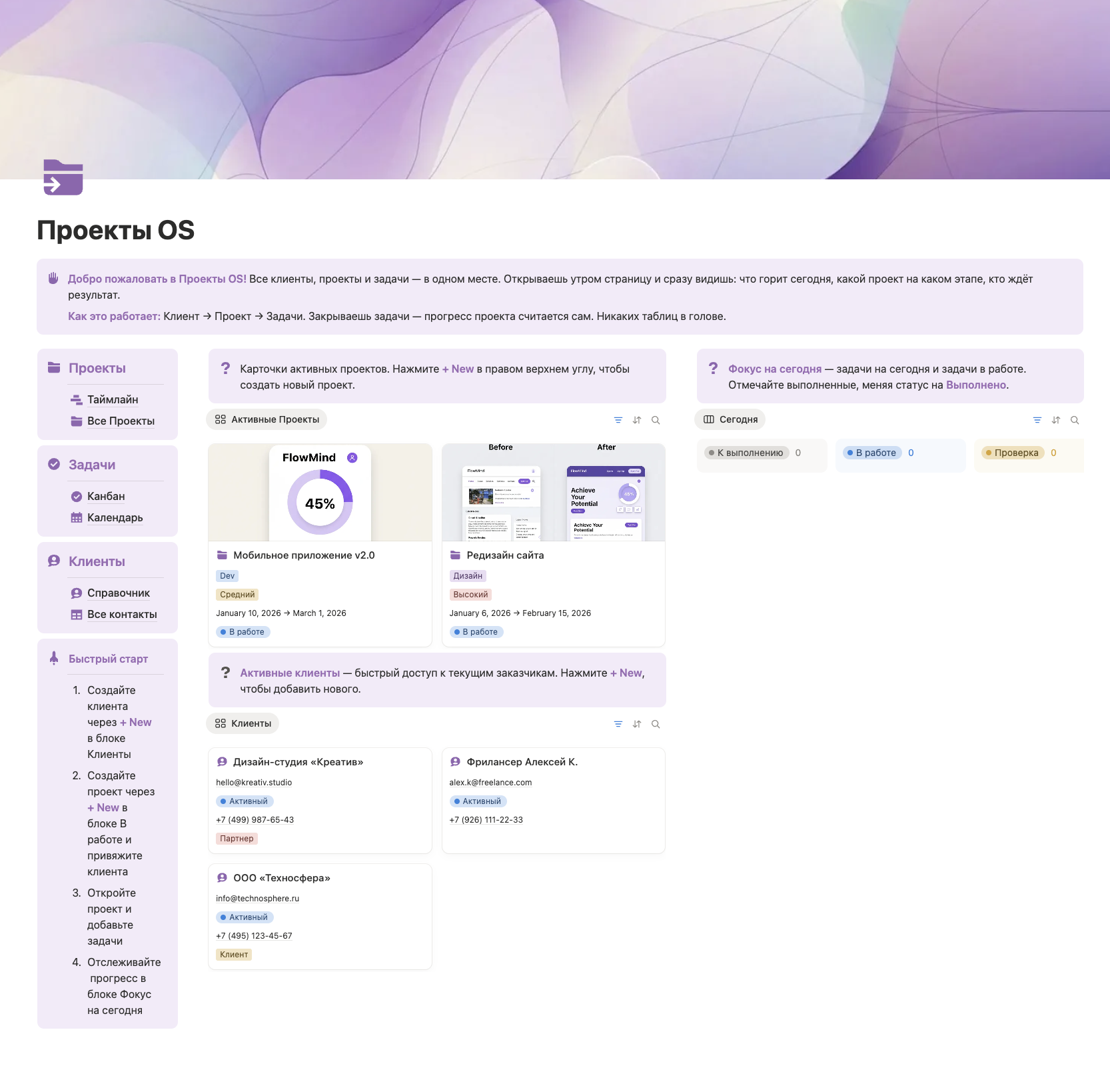 Представь диспетчерскую, где каждый проект — на радаре. Это полнофункциональная система Notion для управления проектами и клиентами.