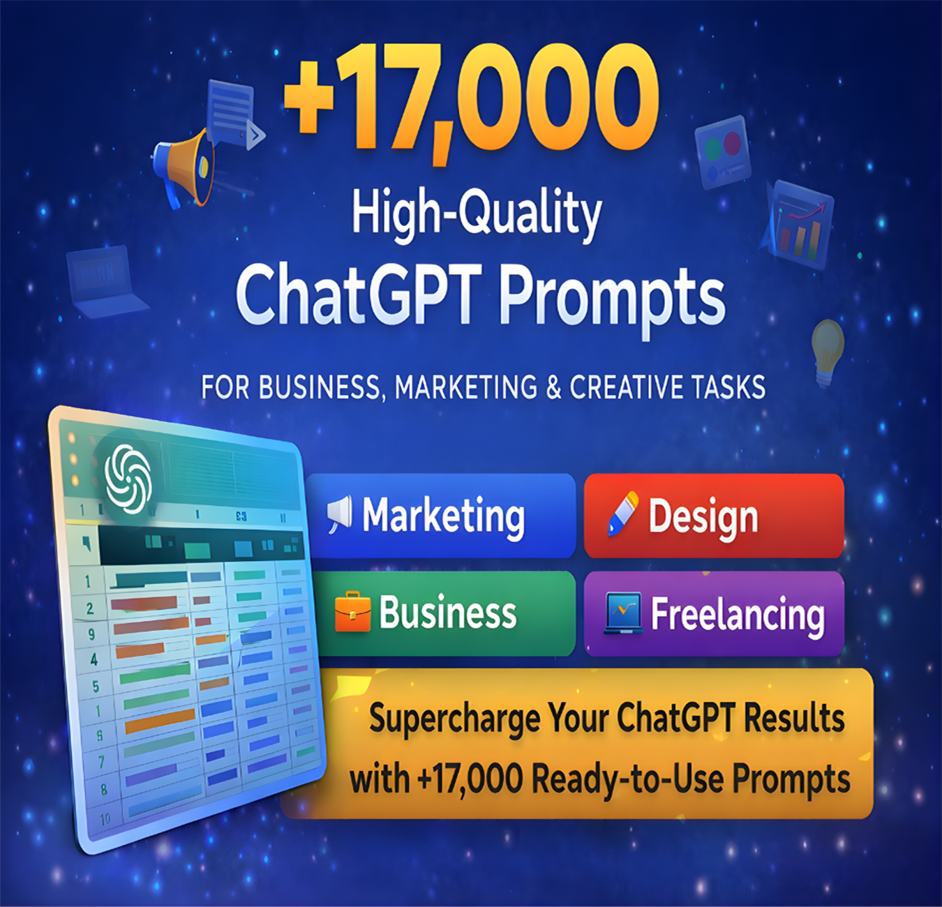 Подсказки структурированы и классифицированы для поддержки владельцев бизнеса, маркетологов, фрилансеров, дизайнеров, копирайтеров и создателей контента в их повседневной работе. Независимо от того, нужна ли вам помощь в создании рекламных текстов, идей для графического дизайна, консультаций по бухгалтерскому учету или креативного мозгового штурма, эта библиотека подсказок сэкономит время и повысит производительность.