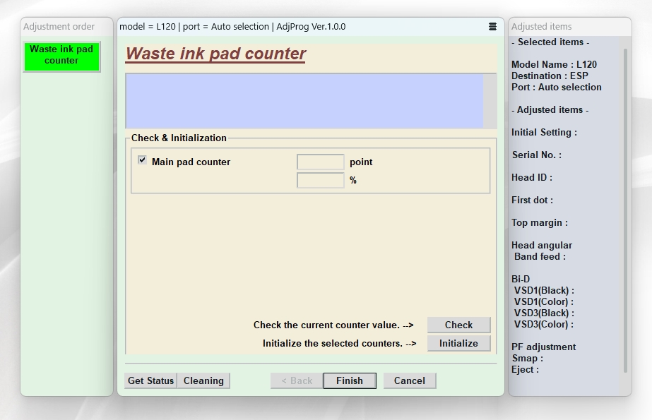 10.В нашем случае переполнен счетчик Main pad counter, что бы его сбросить, ставим возле него галочку и нажимаем кнопку Initialize, мы сбросим оба счетчика. Прошу обратить внимание на такой момент: если в очереди печати остались не напечатанные задания, то программа может зависнуть, поэтому не забудьте очистить очередь печати, в некоторых случаях, стоит перезагрузить компьютер
