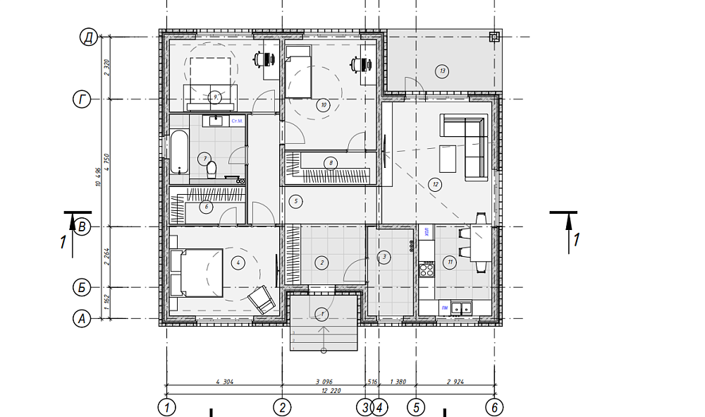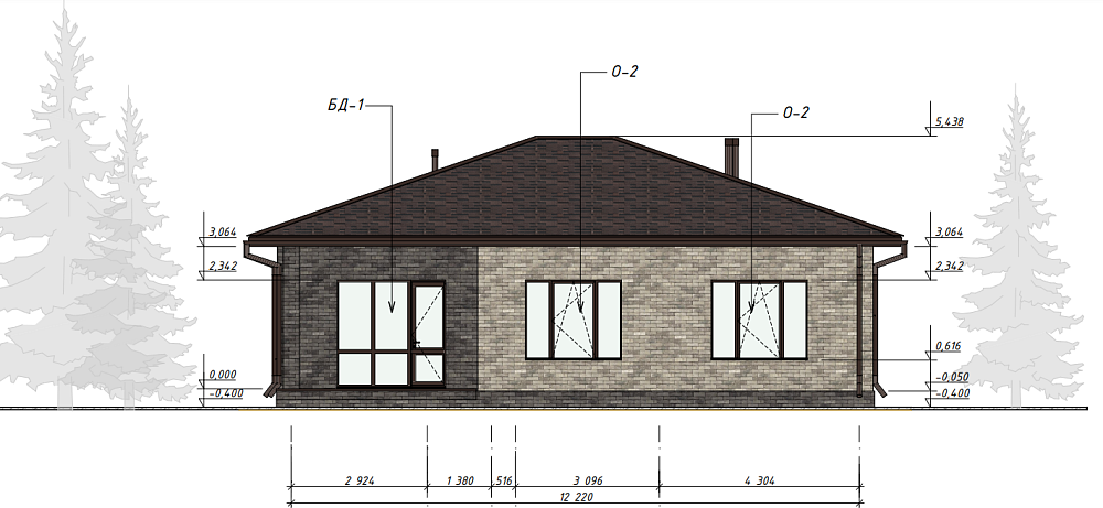Подробный проект частного одноэтажного дома с небольшой трассой. Дом предназначен для семьи из 4 человек.
