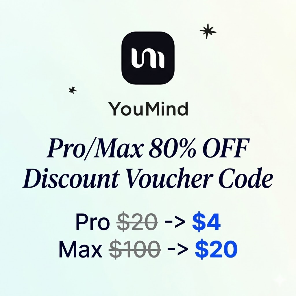 YouMind — это интеллектуальный ИИ-помощник для работы с заметками, базами знаний и документами. Мы предоставляем официальный промокод на скидку 80% для тарифных планов Pro и Max.