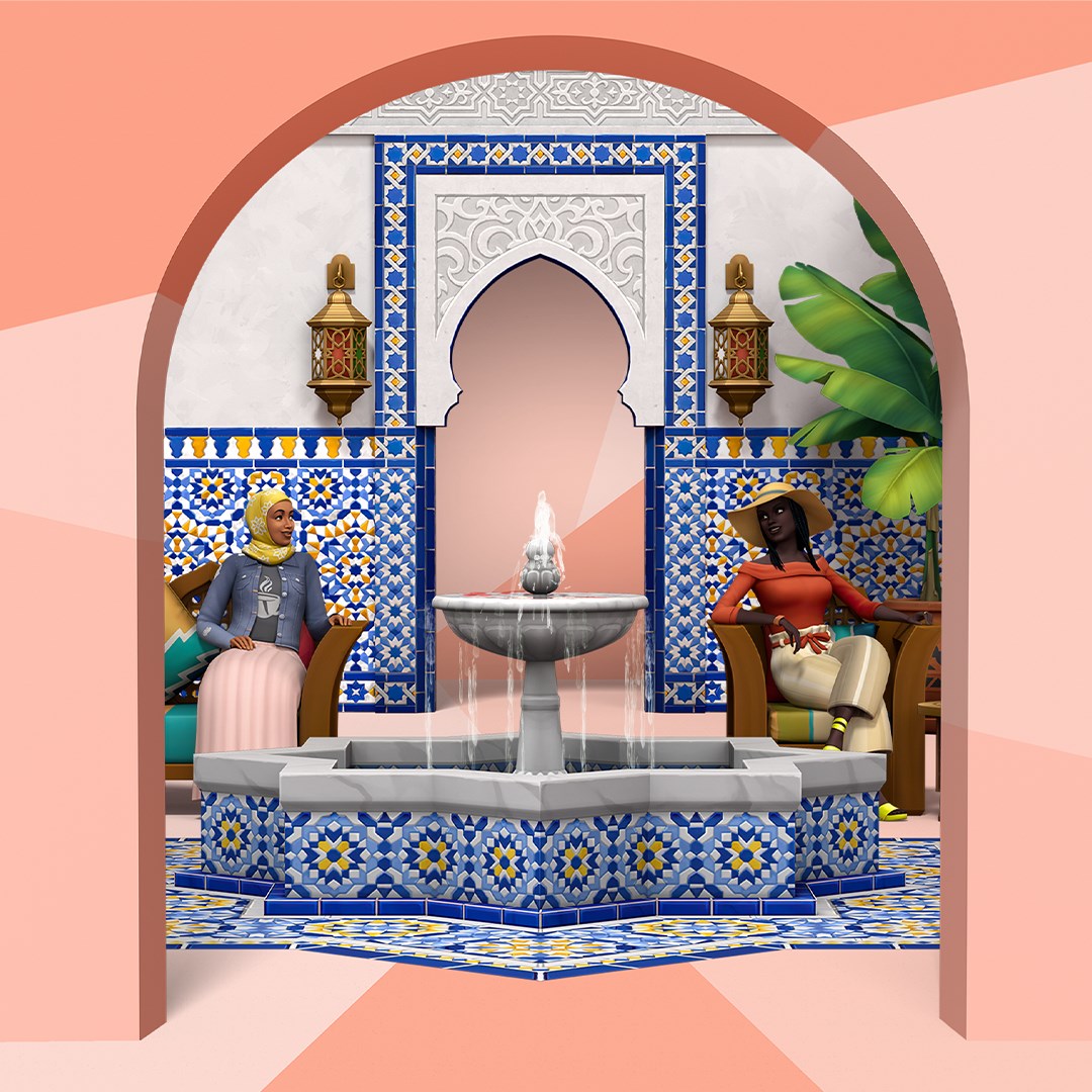 Превращайте центр дома вашего Sim в пышное, яркое пространство, вдохновлённое риадами Марокко, с The Sims™ 4 Courtyard Oasis Kit*! Отдыхайте у фонтана, любуйтесь декоративной плиткой и собирайте семью вместе в абсолютной гармонии.