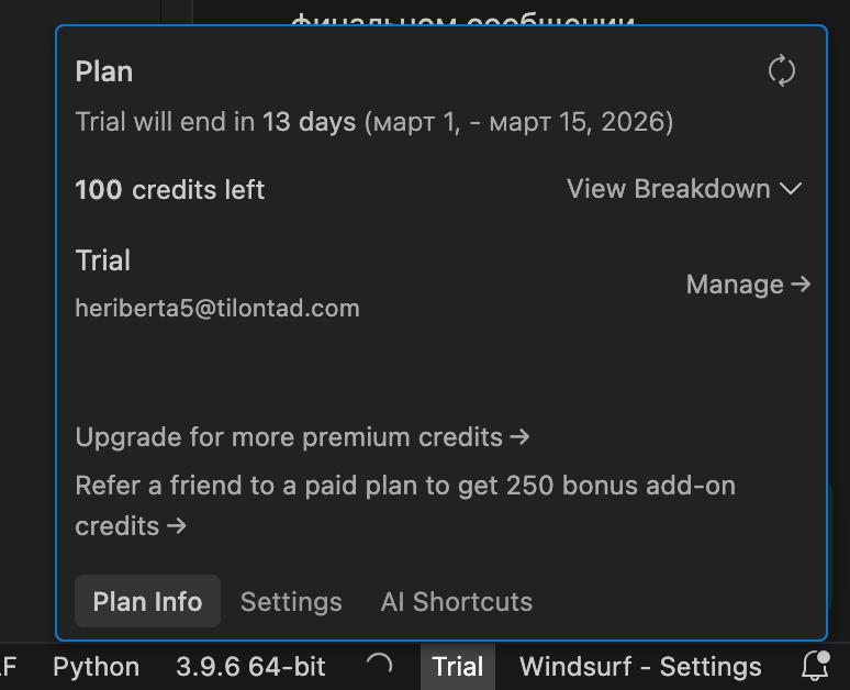 Предлагаю мощный инструмент для тех, кто хочет создавать проекты с помощью ИИ быстро и эффективно! Вы получаете готовый пробный аккаунт для передовой среды разработки Windsurf.