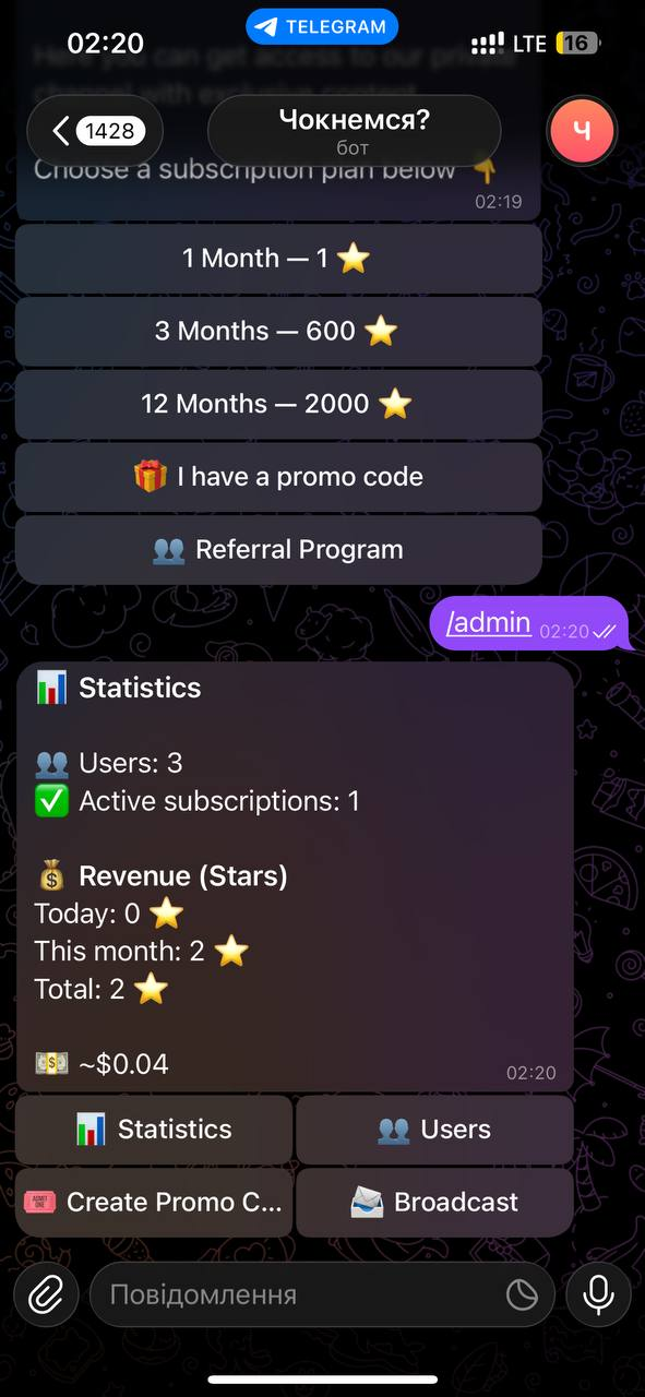 • Оплата через Telegram Stars (встроенная система)