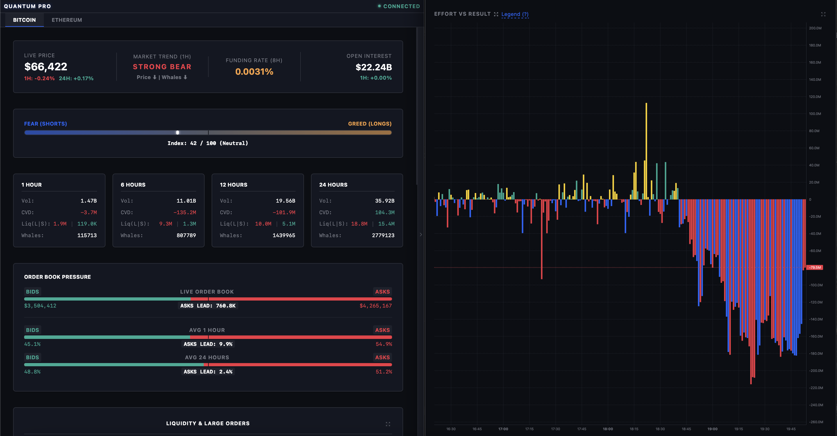* Глубокая аналитика деривативов: Кумулятивная дельта объема (CVD) с разбивкой по торговым сессиям (Азия, Европа, США), глобальный Открытый Интерес (OI), анализ давления в стакане (Order Book Pressure) и индикаторы усилий против результата (Effort vs Result) для поиска разворотных точек.