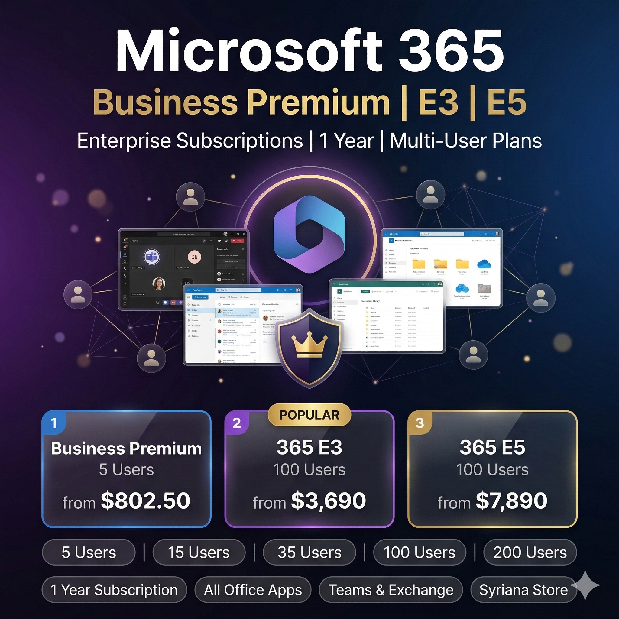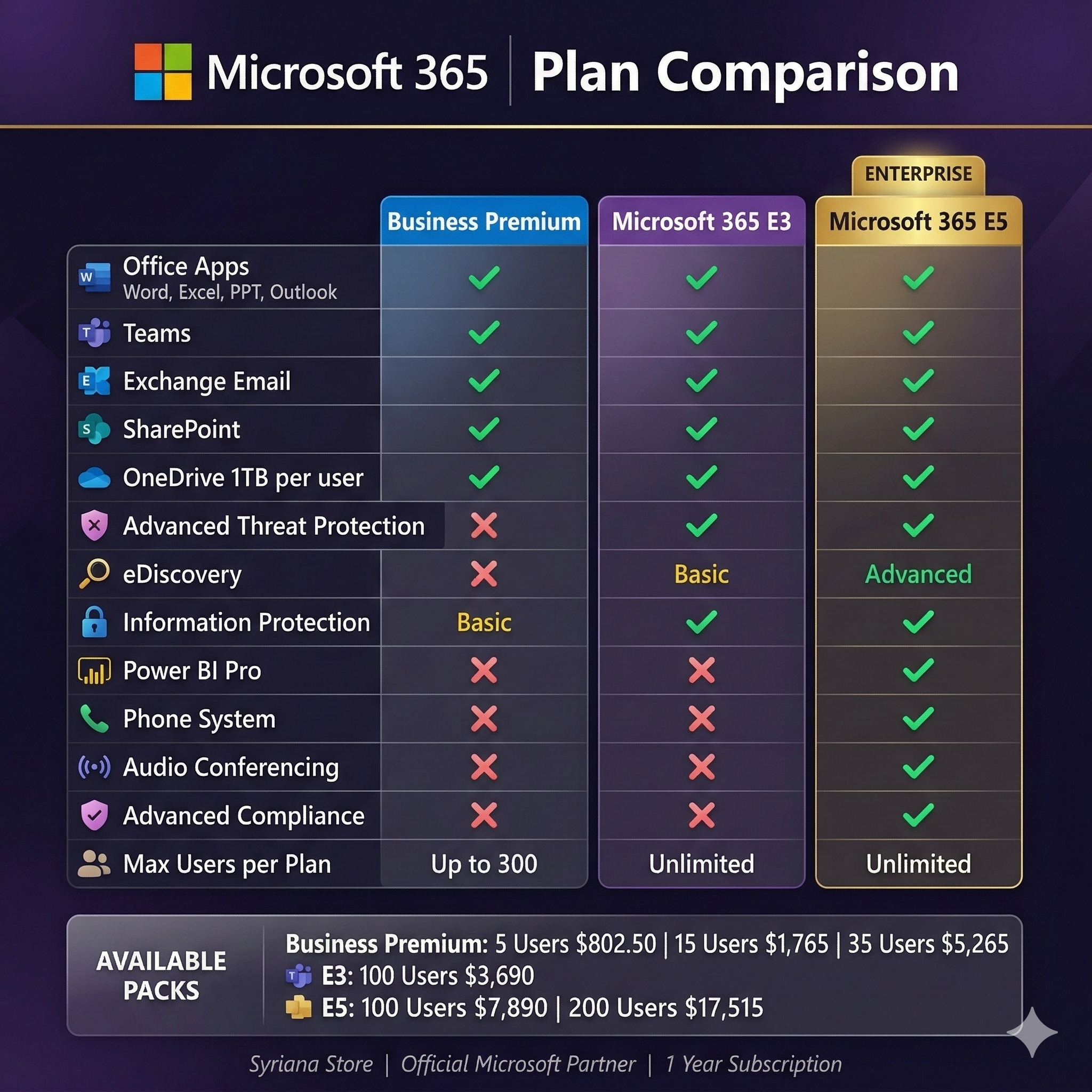 E3: Корпоративный план. Всё из Business Premium плюс расширенная защита информации, eDiscovery и лицензия Windows Enterprise.