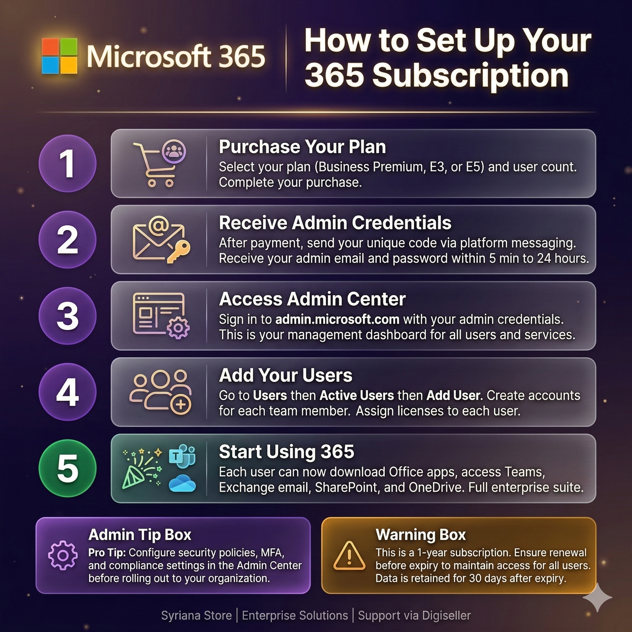 1. После оплаты вы получите учётные данные администратора (Email + Пароль) для центра администрирования Microsoft 365.