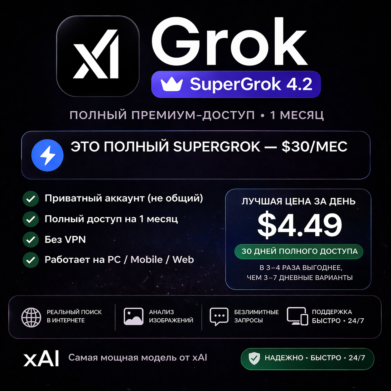 Вы получаете полную подписку SuperGrok за $30/месяц — доступ ко всем премиум-функциям.