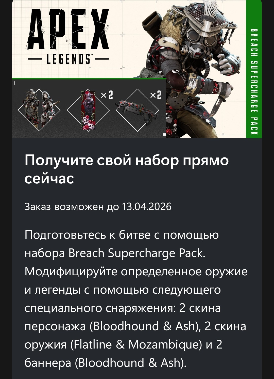 Подготовьтесь к битве с помощью набора Breach Supercharge Pack. Модифицируйте определенное оружие и легенды с помощью следующего специального снаряжения: 2 скина персонажа (Bloodhound & Ash), 2 скина оружия (Flatline & Mozambique) и 2 баннера (Bloodhound & Ash).