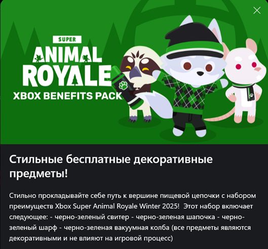 Стильные бесплатные декоративные предметы! Стильно прокладывайте себе путь к вершине пищевой цепочки с набором преимуществ Xbox Super Animal Royale Winter 2025! Этот набор включает следующее: - черно-зеленый свитер - черно-зеленая шапочка - черно- зеленый шарф - черно-зеленая вакуумная колба (все предметы являются декоративными и не влияют на игровой процесс)