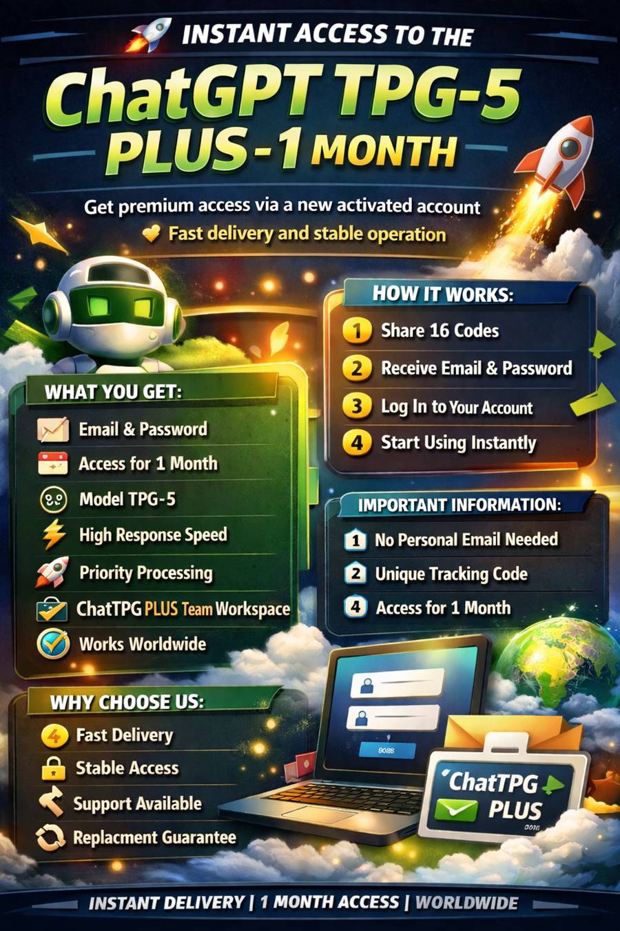🚀 Мгновенный доступ к вашему активированному аккаунту ChatGPT TPG-5 Plus — на 1 месяц
