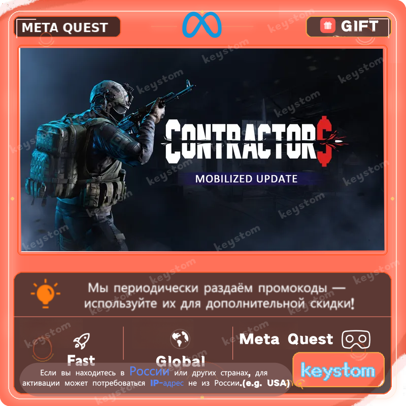 Contractors представлен в Meta Store как интенсивный military shooter с быстрыми онлайн-сражениями и полноценными кооперативными миссиями. Магазин позиционирует игру как тактический VR-шутер, рассчитанный и на мультиплеерные перестрелки, и на совместное прохождение.