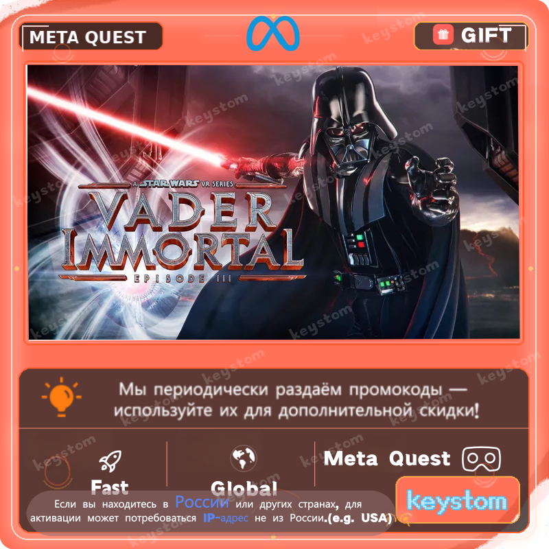 Vader Immortal: Episode III представлен в Meta Store как финальная часть истории Vader Immortal, где игроку предлагается принять свою судьбу и завершить путешествие с древним световым мечом в руках.