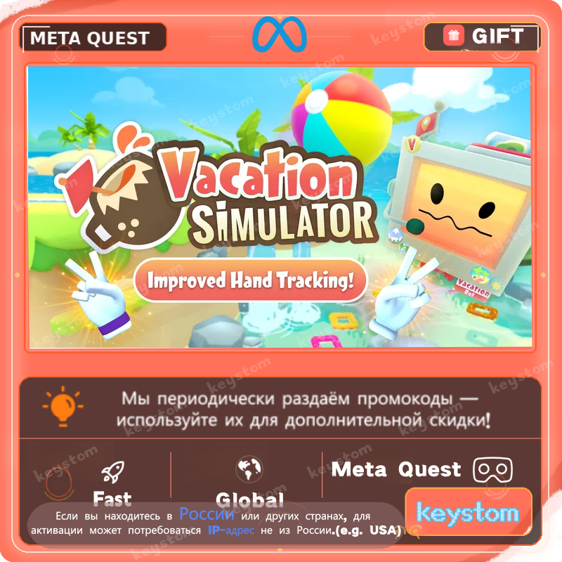 Vacation Simulator представлен в Meta Store как яркий и весёлый VR-симулятор отдыха, а текущее описание магазина отдельно подчёркивает улучшения освещения для Meta Quest 3.