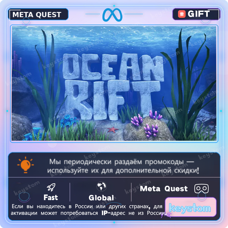 Ocean Rift представлен в Meta Quest как подводный сафари-парк в VR, где можно исследовать морской мир с дельфинами, акулами, черепахами, скатами и другой морской жизнью.