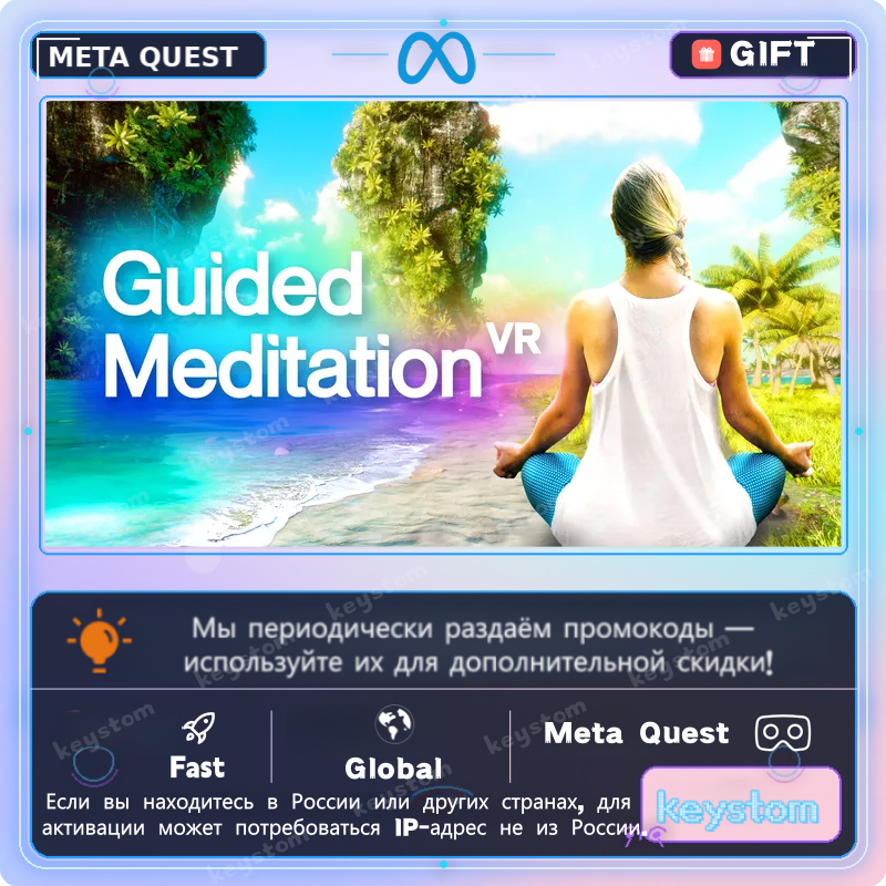 Guided Meditation VR представлен в Meta Quest как приложение для медитации и расслабления, созданное для поддержки спокойствия и концентрации в иммерсивных окружениях.