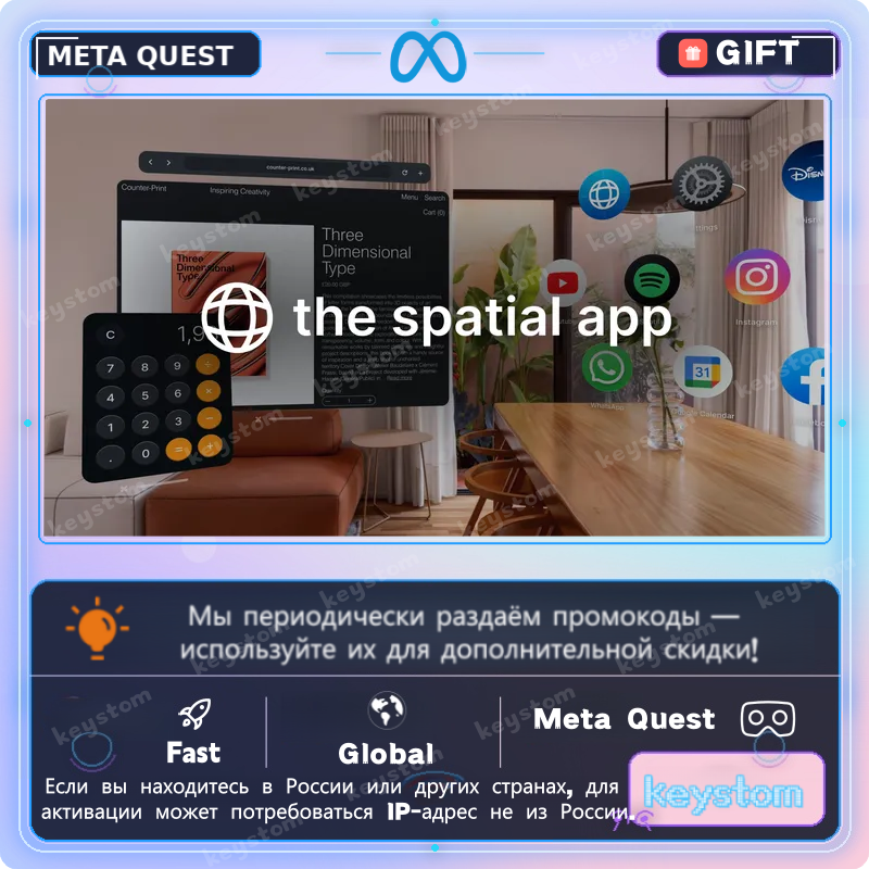 The Spatial App представлен в Meta Quest как пространственное приложение для работы и медиа, которым можно пользоваться как контроллерами, так и руками, как вблизи, так и на расстоянии.