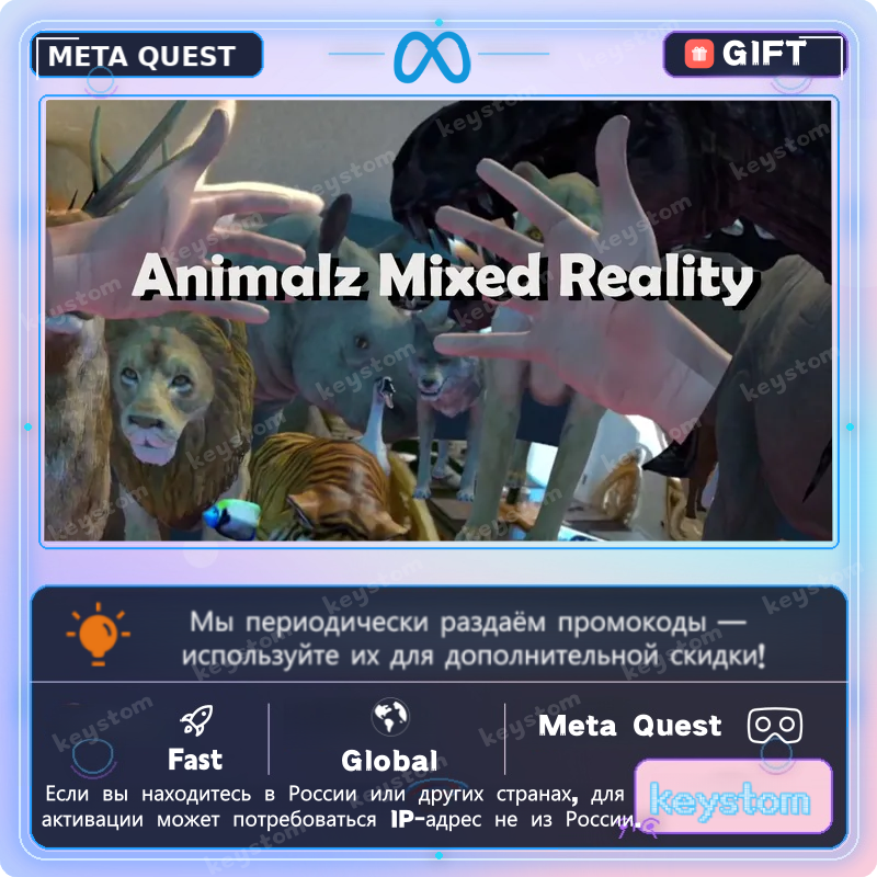 Animalz Mixed Reality для Meta Quest переносит животных с поддержкой passthrough прямо в ваше реальное пространство в mixed reality. Meta подчёркивает возможность размещать и перемещать животных, использовать random spawn и быстро удалять объекты, поэтому товар подойдёт покупателям, которые ищут animal app для Meta Quest, MR creativity title или mixed reality passthrough experience.