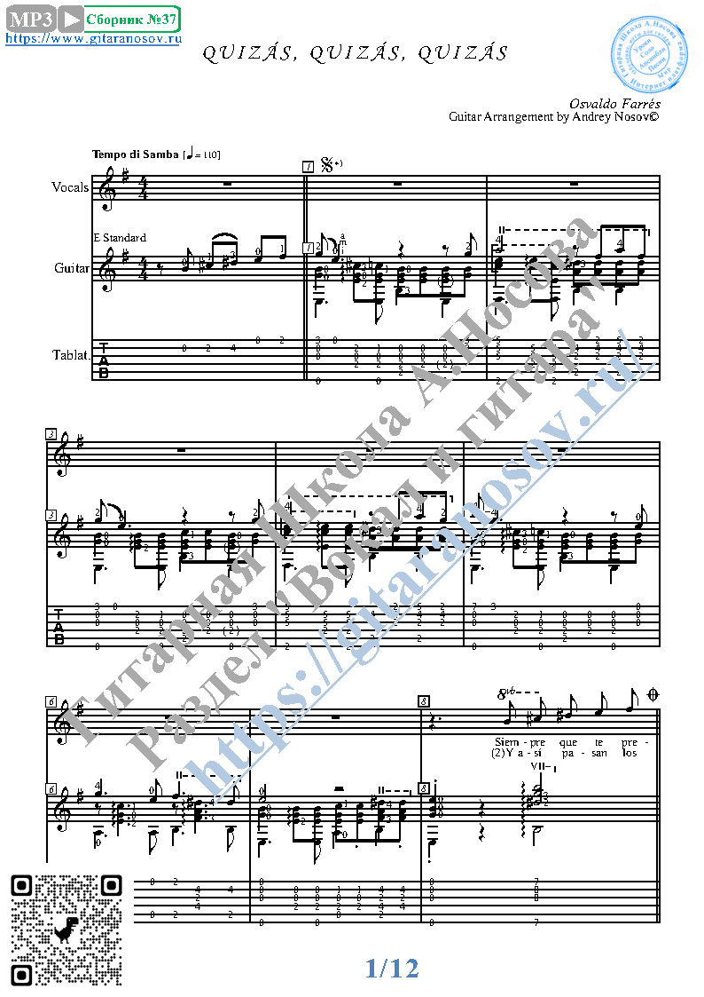 Вашему вниманию предлагается композиция "Quizas, Quizas, Quizas (O.Farres)", предназначенная для вокала в сопровождении 6-ти струнной гитары. Запись выполнена нотами и включает в себя партию вокала с подтекстовкой, партию гитары с подробнейшей аппликатурой и текст песни (НА ПОРТУГАЛЬСКОМ). Партия гитары продублирована табулатурой.