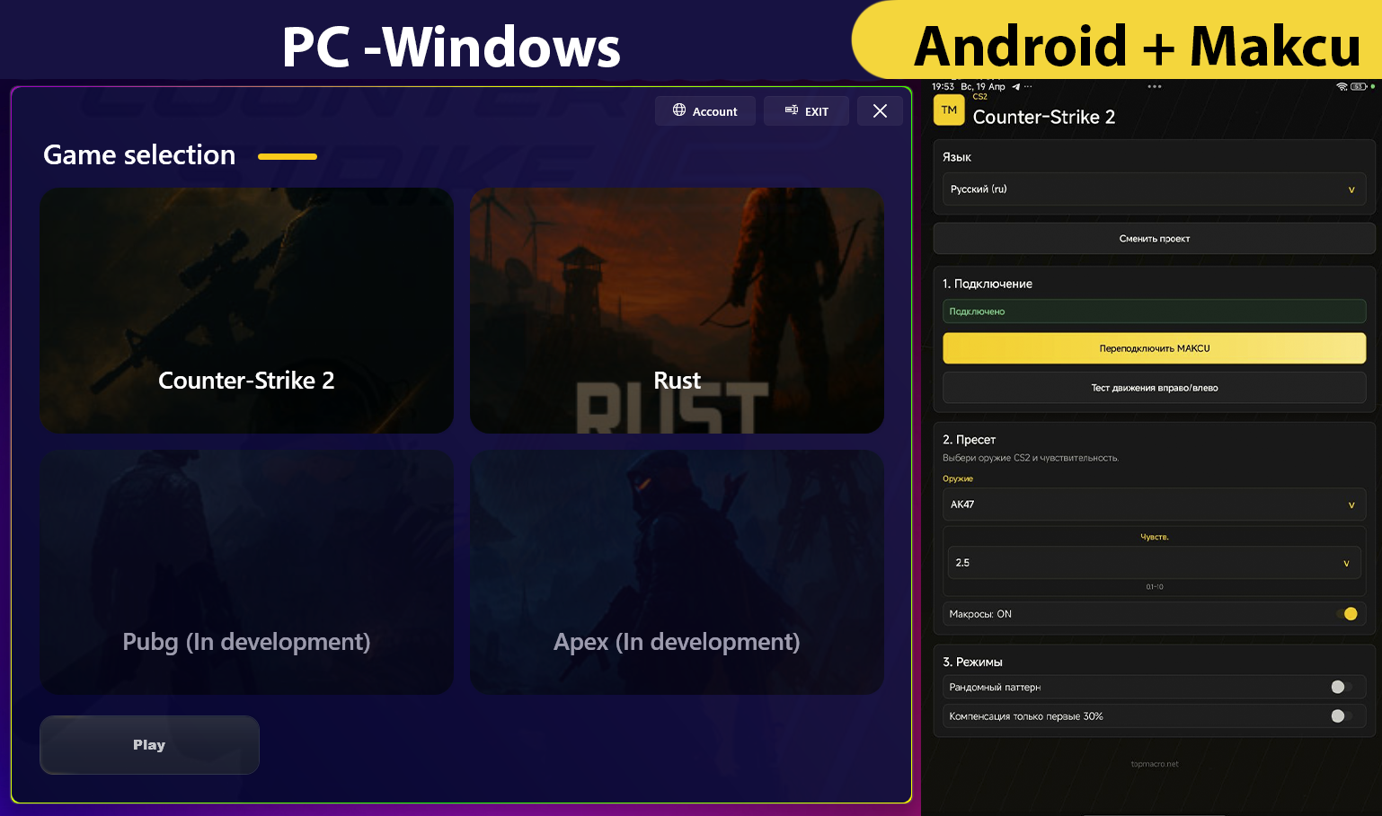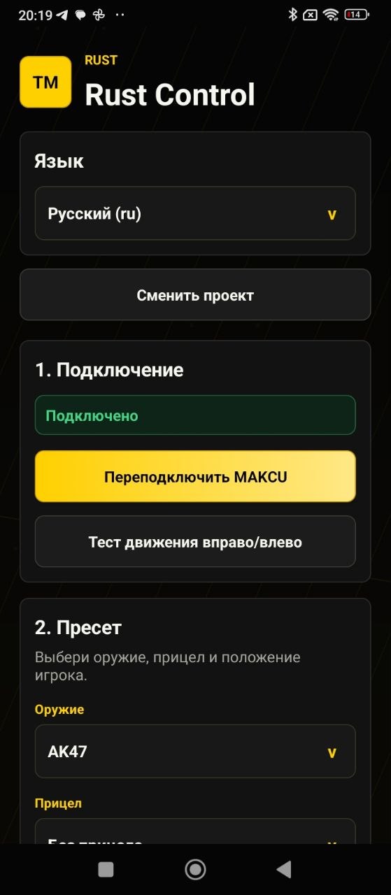 <div style="padding:14px 16px;border:2px solid #ffce1b;border-radius:10px;background:#1e1e1e;color:#fff;font:16px Segoe UI,sans-serif;box-shadow:0 0 10px #ffce1b"><b style="color:#ffce1b">Бесплатный ключ на 1 день<ol style="margin:10px 0 12px 20px;padding:0">Зарегистрируйтесь и войдите в <a href="https://topmacro.net/login"; target="_blank" style="color:#00afff">личный кабинетНажмите «Получить 1 день»Скачайте программу и войдите в аккаунтТакже в одну подписку входит доступ к нашему уникальному приложению на Android с макросами. Для данного приложения вам нужно отдельно докупить плату Makcu. Смысл такого подхода заключается в том, что используя Makcu + ваш телефон (Android), вы максимально обезопасите себя от любых проверок и блокировок, так как на основном ПК вы ничего не запускаете кроме самой игры (очень актуально для игр RUST и Faceit). <a href="https://topmacro.net/obhod-blokirovok-myshek-rust">ПодробнееpstrongВНИМАНИЕ!/strongДля обычной Steam-версии игры CS2 плата Makcu не обязательна. Если вы покупаете программу для игры RUST или CS2 на Faceit, вам обязательно нужна плата Makcu для безопасного использования макросов через нашу программу для Android или Windows PC (без данной платы макросы не будут работать). Если вы играете через облачные сервисы, например GeForce NOW, то вам данная плата не нужна./ppПо игре RUST - <a href="https://topmacro.net/obhod-blokirovok-myshek-rust">подробнее/a/pИИ-ПОМOЩНИК ДЛЯ АВТОНАВЕДЕНИЯ