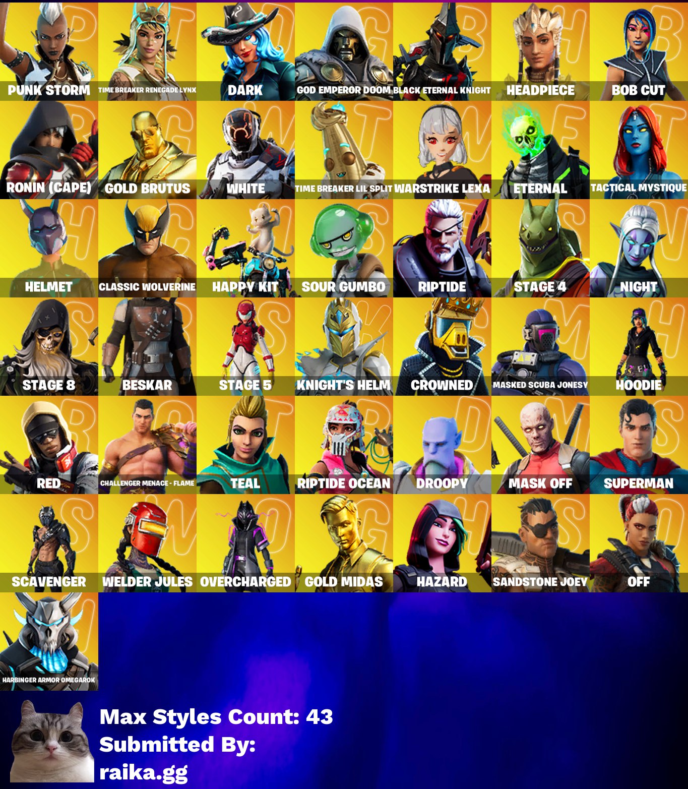 • После покупки вы получаете аккаунт Fortnite с 114 скинами (возможно наличие купленного PVE-режима). Данные предоставляются из игры + данные с почты. На аккаунте будет задержка на смену почты.