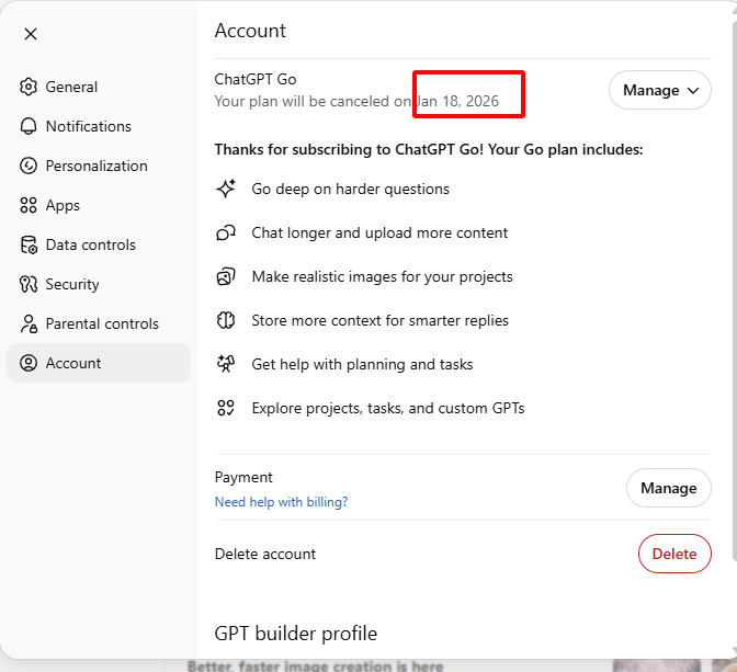 Подписка ChatGPT Go действительна в течение 12 месяцев.