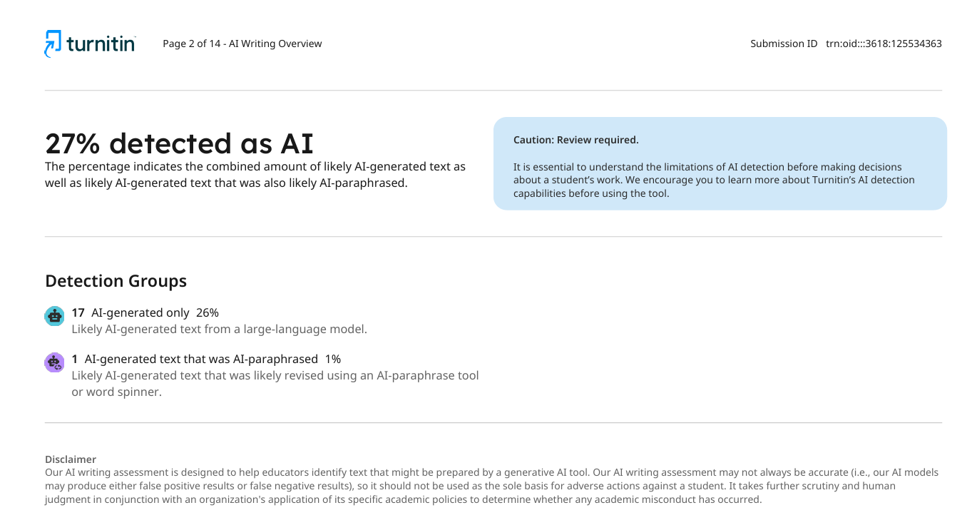 Получите подробный отчет Turnitin, который проверит ваш документ на плагиат и контент, сгенерированный ИИ. Идеально подходит для студентов, исследователей и писателей, которым необходима быстрая и надежная проверка.